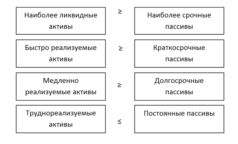 Чтобы можно было правильно определить ликвидность баланса, рекомендуется активы и пассивы правильно сопоставить. Таким образом, изобразим схему соотношения: