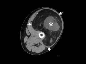 Компьютерная томография (КТ) – сканирование левого бедра. Новообразование выделено стрелками. В центре наблюдается мягкотканный компонент (звездочка).