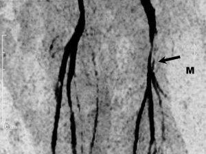 Магнитно-резонансная ангиография сосудов ног у мужчины 67 лет. Жалуется на медленно растущую массу на левой ноге. На изображении видно медиальное смещение и сдавление левой бедренной артерии, поверхностной бедренной артерии. Данная опухоль привела к хромоте.