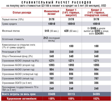 Расчет расходов по кредиту и лизингу, пример