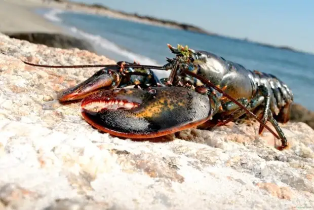Лобстер – самый крупный представитель ракообразных. Достигает в длину 40-50 и более сантиметров. Это увеличенная в разы копия пресноводного сородича – речного рака. Лобстеры – хищники. Охотятся по ночам на мелкую рыбу и моллюски. Массивные клешни с зазубренной кромкой вместо передних конечностей – мощное оружие для добывания пищи и самообороны. Под твердым хитиновым панцирем находятся четыре пары лап. Хвост составляет примерно одну треть от всего тела животного.