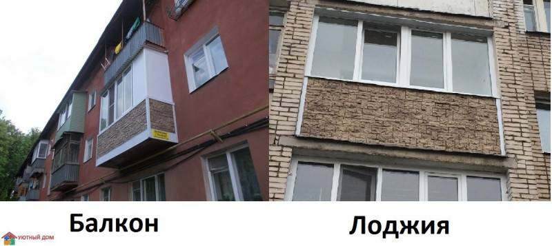 Внешне легко отличить балкон от лоджии по исполнению. Первый полностью выступает за пределы фасада и открыт с трех сторон. Второй является частью несущих конструкций, встроен в стены здания и открыт обычно только в одной плоскости. В обоих случаях это отдельные неотапливаемые помещения с остеклением или без него.