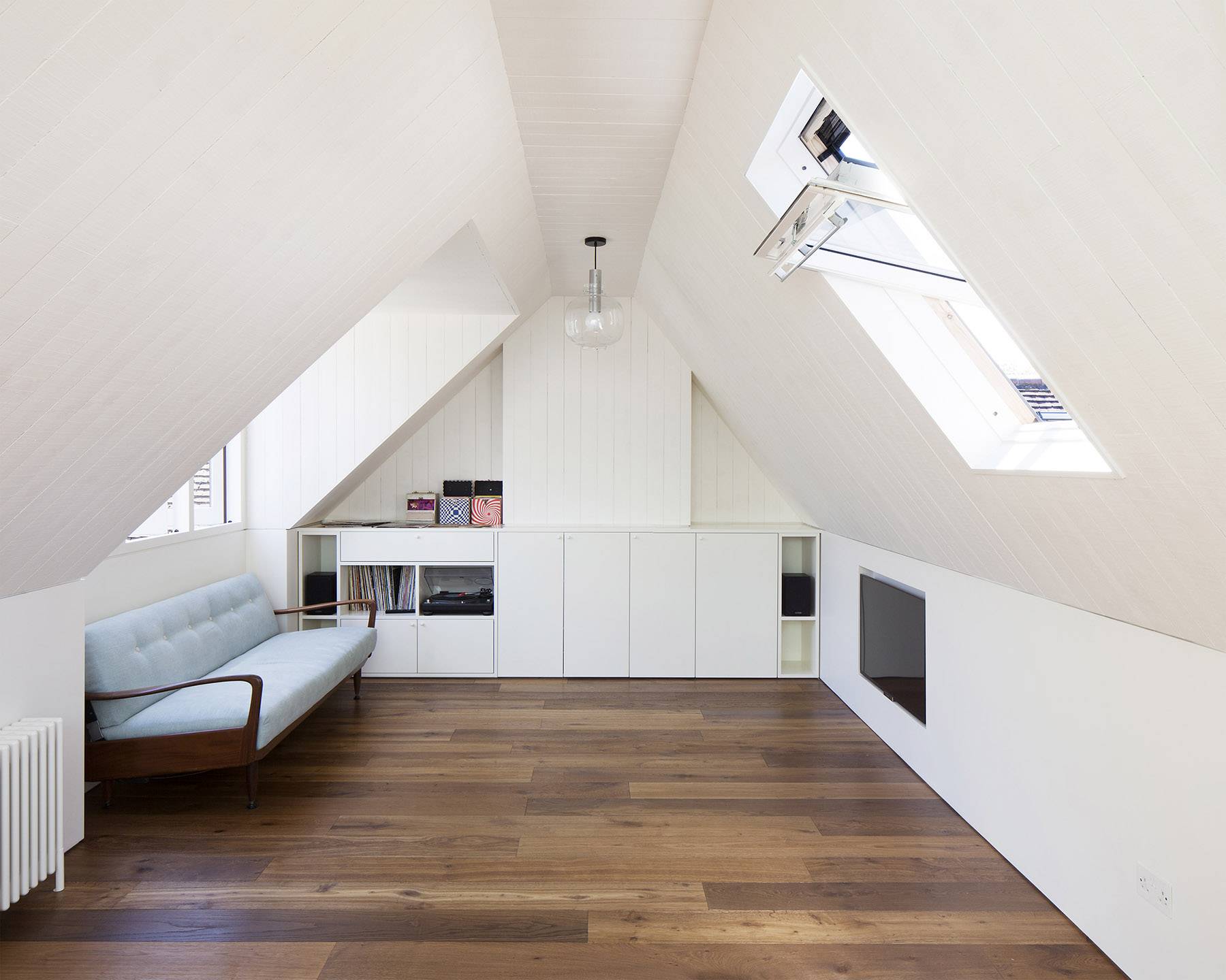 Мансардное окно или эффектная комбинация окон осветит именно ту часть мансарды, в которой необходимо естественное освещение. А у вертикальной торцевой стены найдется место для удобного шкафа, книжных стеллажей и т. д.