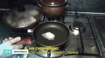 - На сковородке масло разогревается без пузырей, остатка, неприятного аромата до полного жидкого состояния.