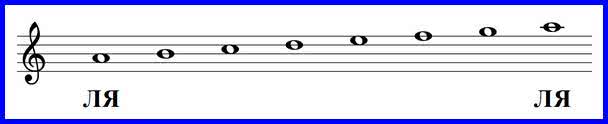 Сейчас для краткости рассмотрим только один пример. Допустим, нам нужно получить гамму Ля мажор (буквенное обозначение – A-dur). Гамма эта начинается со звука ЛЯ и заканчивается им же. Соответственно, для начала мы можем просто написать звукоряд нот от ЛЯ до следующей, более высокой ЛЯ, то есть сделать своеобразную заготовку.