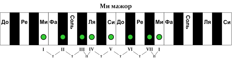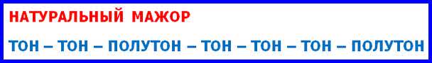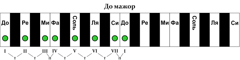 До – (тон) – Ре – (тон) – Ми – (полутон) – Фа – (тон) – Соль – (тон) – Ля – (тон) – Си – (полутон) – До