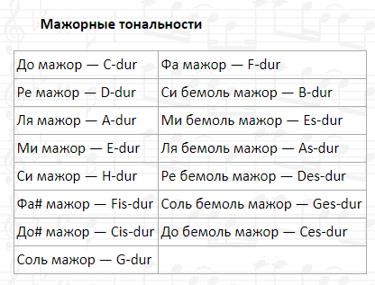 В мажорной тональности возле обозначения тоники будет стоять значок диеза или бемоля без дополнительных символов. Например, C♯ («до-диез мажор»), D♯ («ре-диез мажор»), A♭ («ля-бемоль мажор»), В♭ («си-бемоль мажор») и т.д. Можно встретить и другие обозначения тональностей. Например, когда к ноте дописывается слово major или minor, а вместо значка диеза или бемоля – слово sharp или flat.