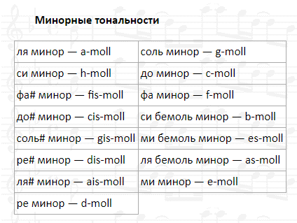 Пониженная или повышенная относительно основной ступени звукоряда тональность обозначается известными вам значками диеза и бемоля. Если вы видите запись тональности в формате, к примеру, F♯m или G♯m, это значит, что перед вами произведение в тональности «фа-диез минор» или «соль-диез минор». Сниженная тональность будет со значком бемоля, т.е. A♭m (ля-бемоль минор»), B♭m («си-бемоль минор») и т.д.