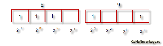 (в двоичной системе), каждый из которых представляет из себя двойку в степени (начиная с нулевой и до двойки в седьмой — считается справа налево), как показано на приведенном ниже рисунке: