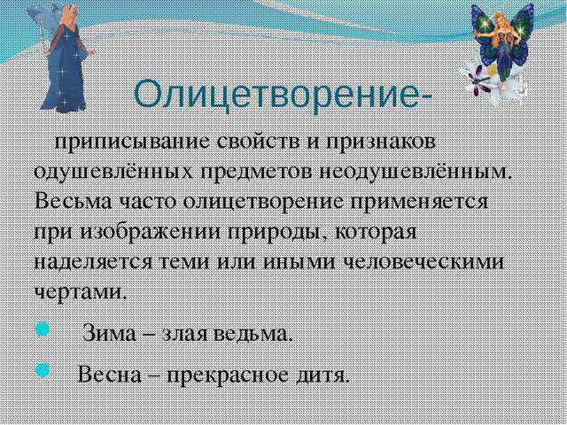 Часто писатели и поэты прибегают к одной из разновидностей метафоры — олицетворению, чтобы создать ёмкий и яркий образ природы или явления. Художники слова наделяют неживые предметы свойствами и качествами человека. Так возникает олицетворение. Предметы остаются неживыми, но у них появляются человеческие качества. Явления или предметы, животные, птицы ведут себя как люди: разговаривают, думают, печалятся или радуются.