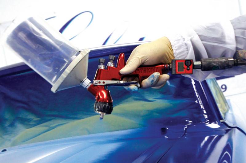 Следующий этап — нанесение базовой подложки. Для этого нет надобности ждать высыхания бесцветной базы. После ее нанесения нужно слить из бачка остатки смеси, слегка промыть пистолет, налить в него подложку и сразу же приступить к нанесению, поскольку только полумокрый слой может обеспечить правильную ориентацию металлических частиц (если это «эффектная» подложка) и полное поглощение опыла.