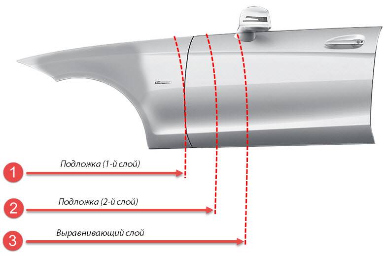 6. Первоначально следует нанести слой подложки, орудуя краскопультом на дистанции от 25 см от авто.