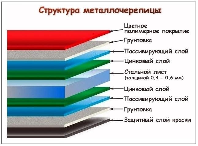 О металлочерепице мы поговорим в соответствующем разделе, а что касается профнастила, то для обеспечения должного уровня защиты металлической основы от коррозии его покрывают: