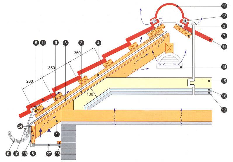 Схема кровельного пирога: 1 – стропило, 2 – контррейка, брусок, 3 – гидроизоляционная пленка, 4 – обрешетка вертикальная, 5 – начальная обрешетина горизонтальная, 6 – обрешетка горизонтальная, 7 – дополнительные бруски обрешетки, 8 – лобовая доска, 9 – крюк водосточного желоба, 10 – карнизная планка, 11 – лист металлочерепицы, 12 – вентилируемый конек, 13 – уплотнитель, 14 – слуховое окно, 15 – утеплитель, 16 – пароизоляционная пленка, 17 – потолочный настил (мансарда), 24 – завершающая планка, 25 – J-фаска, 26 – J-профиль, 27 – софит.