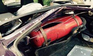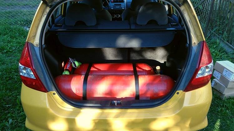 Хранится он в баллонах в автомобиле в сжиженном виде. То есть он жидкий, а не газообразный – «плюхается» в баллоне. Также большим преимуществом является рабочее давление, которое составляет всего 14 атмосфер. Для него нужны емкости из более легкого металла и стенки баллона намного тоньше. Сейчас наибольшее распостранение получили тороидальные баллоны в виде бублика, которые помещяются на место запаски. При этом баллон не занимает места в багажнике, но приходится жертвовать запасным колесом.