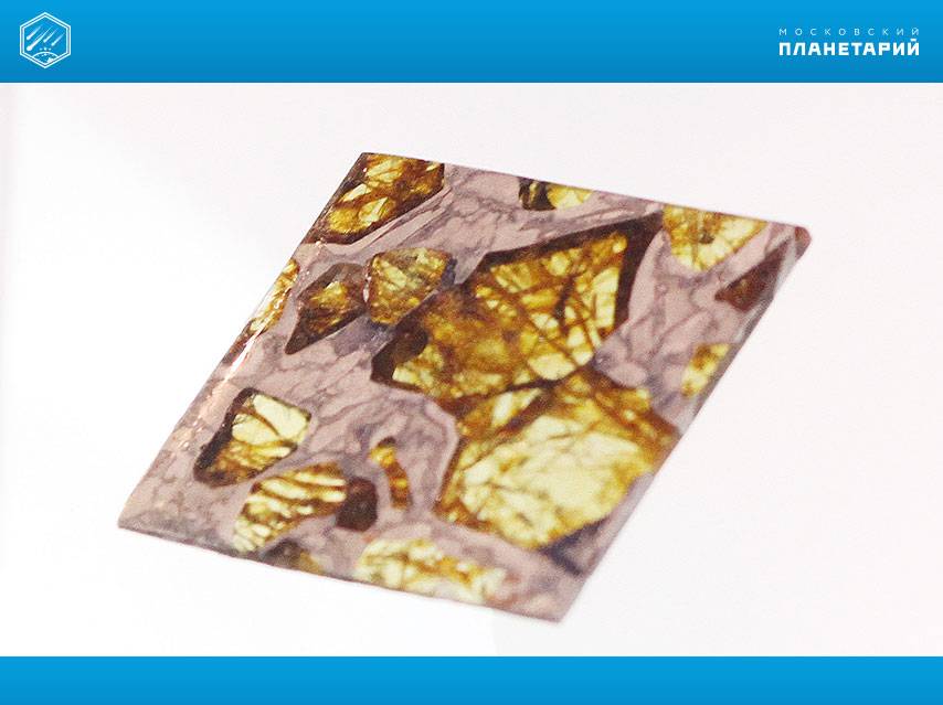 Железо-каменный метеорит (палласит) Fukang. Кристаллы оливина (жёлтое) в никелисто-железной матрице (розовое). Метеоритная коллекция Московского Планетария, №39.