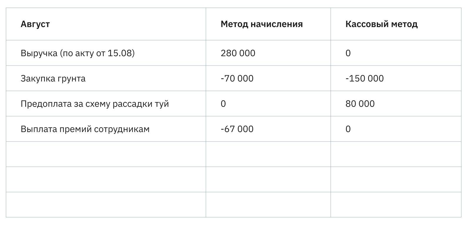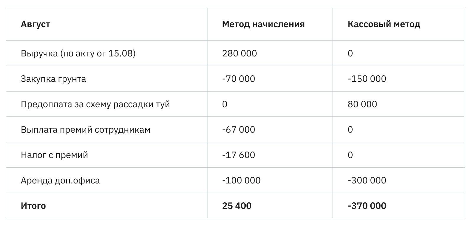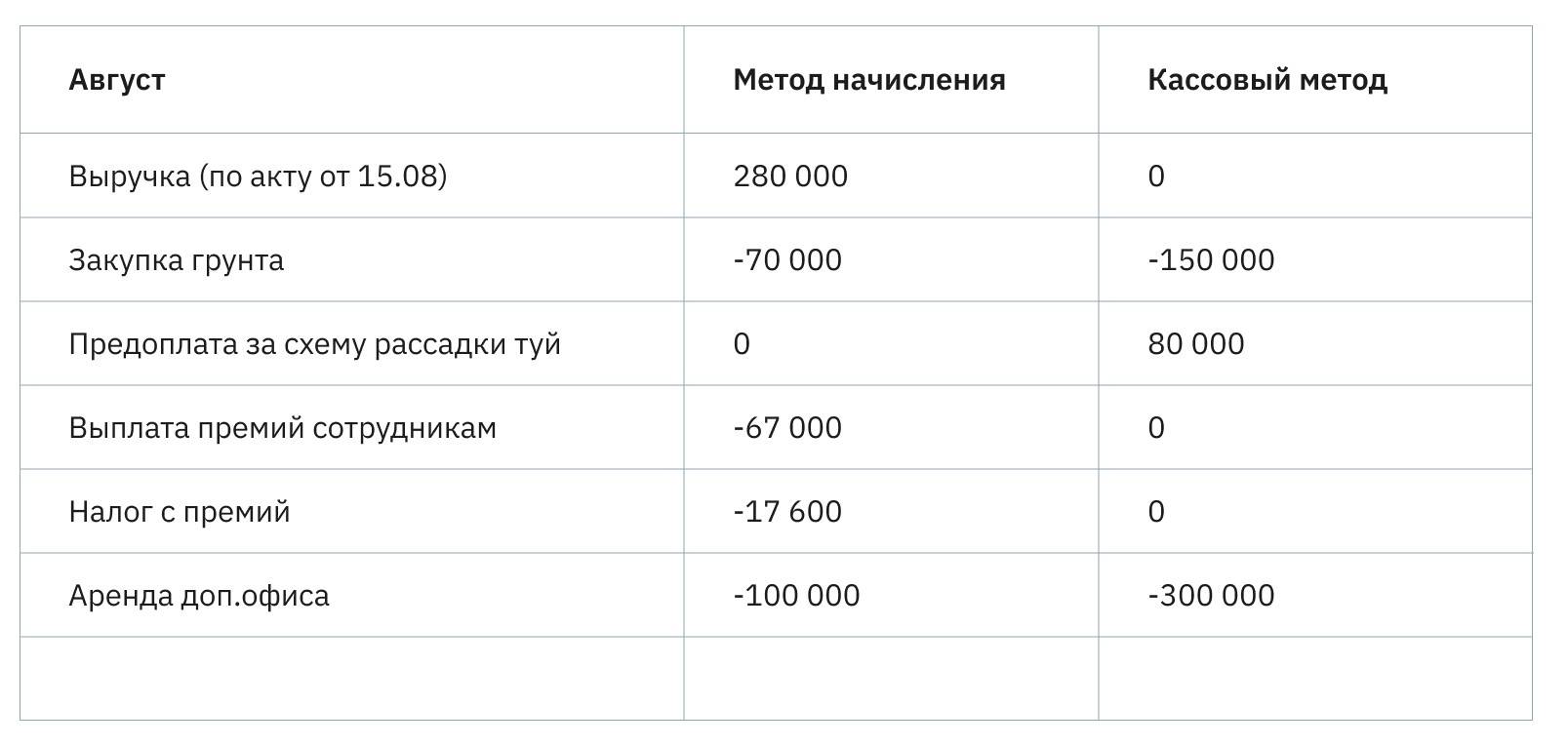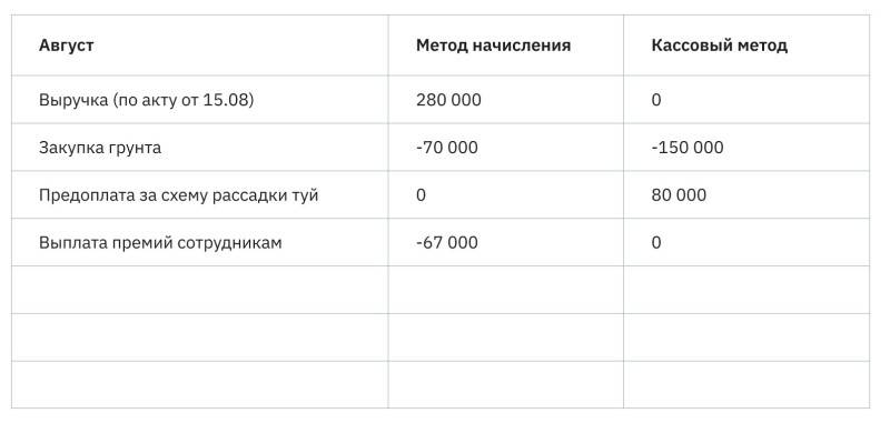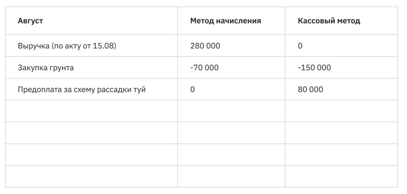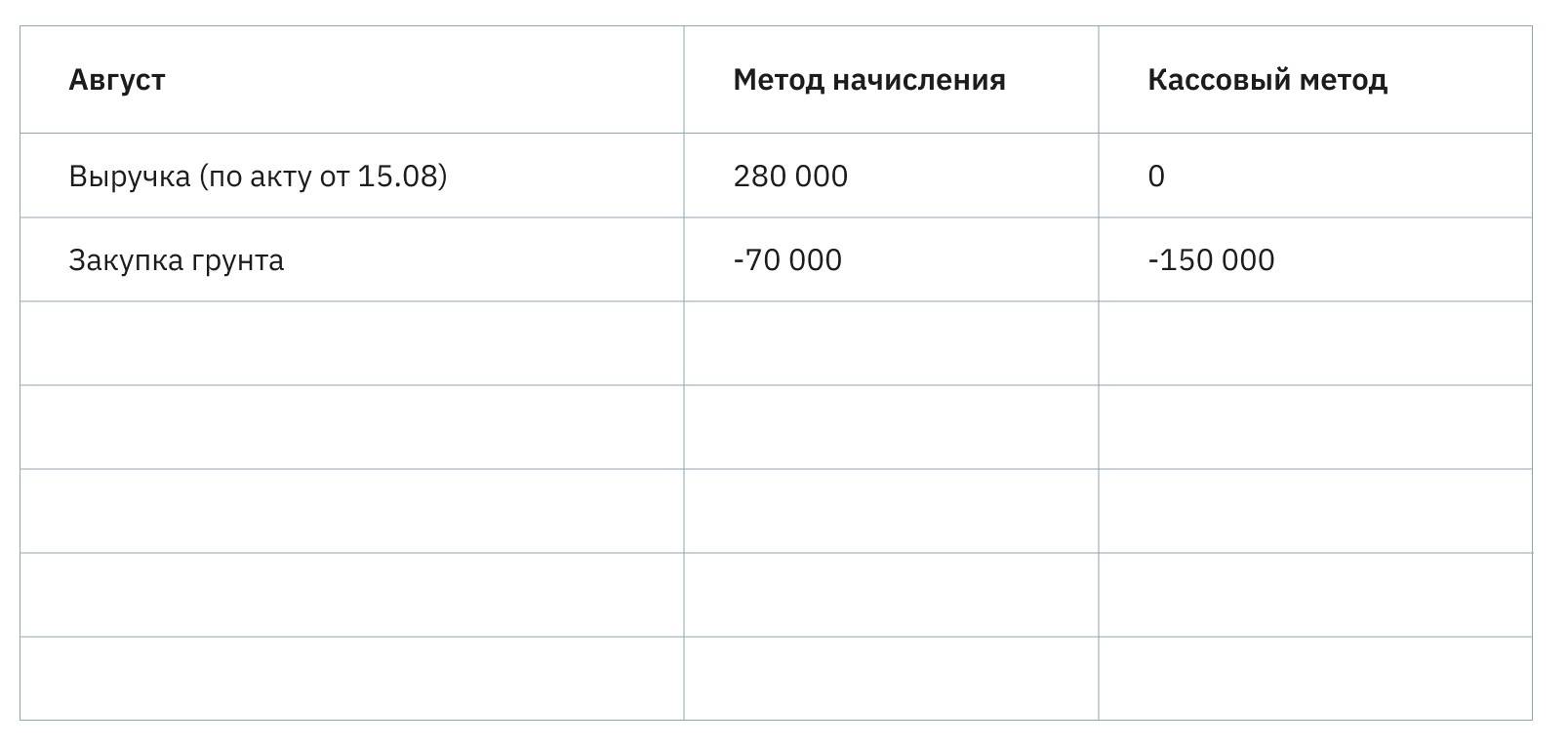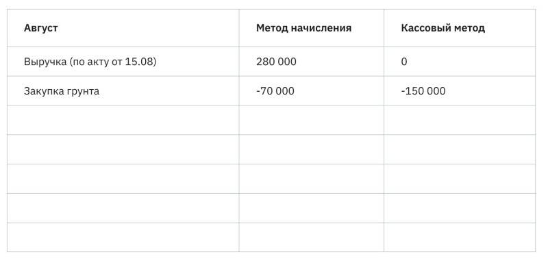 Подбиваем итоги августа и видим – при учете кассовым методом компания сработала в убыток. Однако этот вывод необъективный – на август пошли крупные расходы на аренду и закупку грунта, а пользоваться ими мы будем еще несколько месяцев.