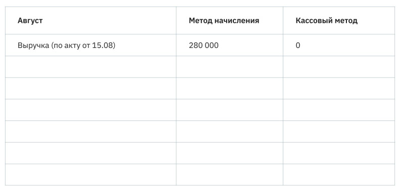 Деньги пришли 7 сентября, поэтому по кассовому методу на август мы приход не учитываем. Но акт был подписан 15 августа и метод начисления обязывает отнести поступление на август