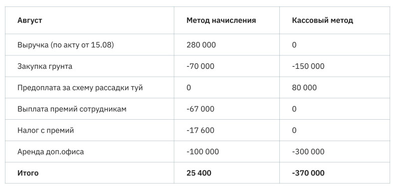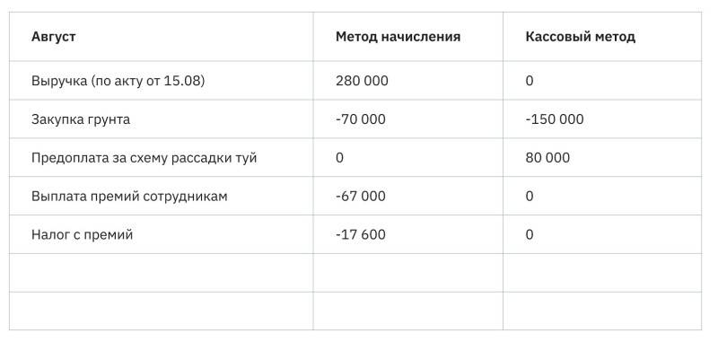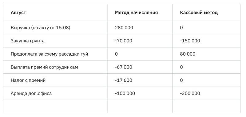В нашем примере кассовый метод показывает убыток, но бывает и наоборот