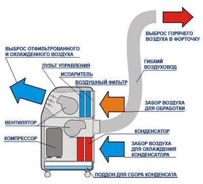 Все элементы прибора, как и в настенном моноблоке, размещены в одном корпусе, разделенном на два сектора. В одном комнатный воздух охлаждается, проходя через фреоновый контур, а во втором секторе находится конденсатор. Из него горячий воздух выходит по гибкому шлангу.