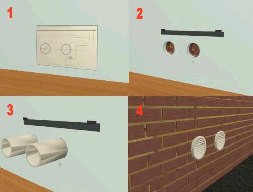 В комплекте с кондиционером ряд производителей поставляют трафарет, на котором указаны все размеры и отмечены необходимые отверстия. Кроме того, в комплект входит установочная пластина, на которую крепится кондиционер, материал для сборки воздуховодов или пластиковая труба, а также решетки, которые легко установить на наружной стене прямо из помещения, без высотных работ.