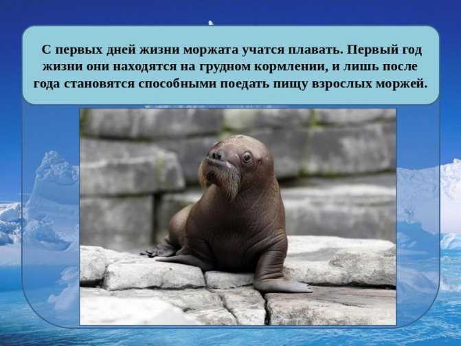 С первых дней жизни моржата учатся плавать. Первый год жизни они находятся на грудном кормлении, и лишь после года становятся способными поедать пищу взрослых моржей.