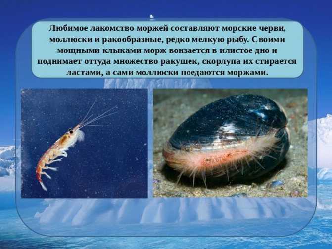 Моржи, в отличие от тюленей, питаются более разнообразной пищей. Они едят не только рыбу, но и моллюсков, включая мидии и устрицы
