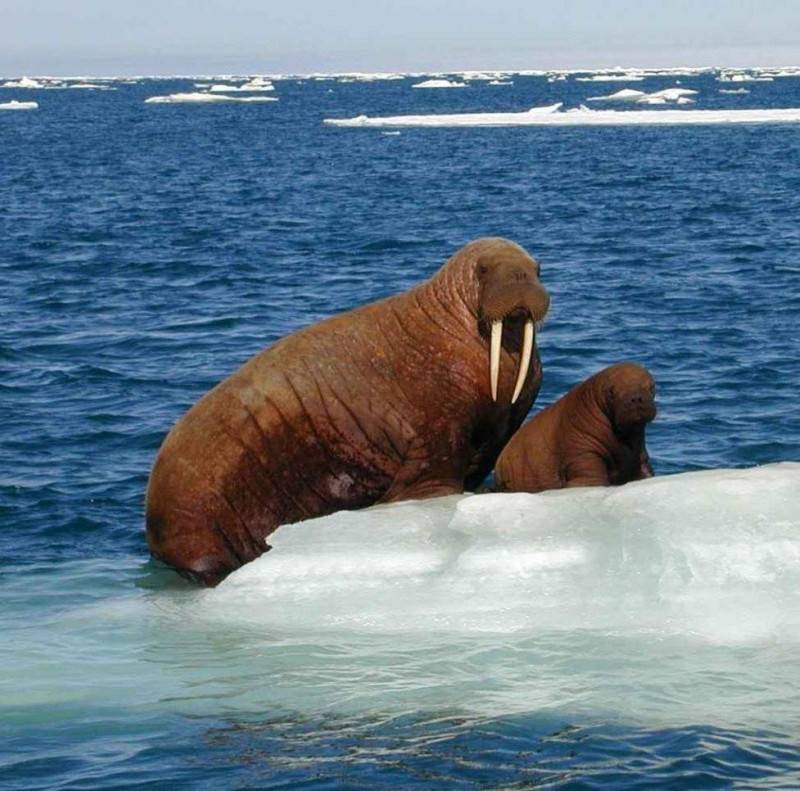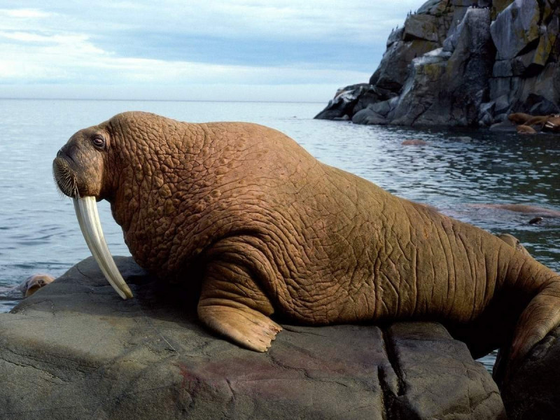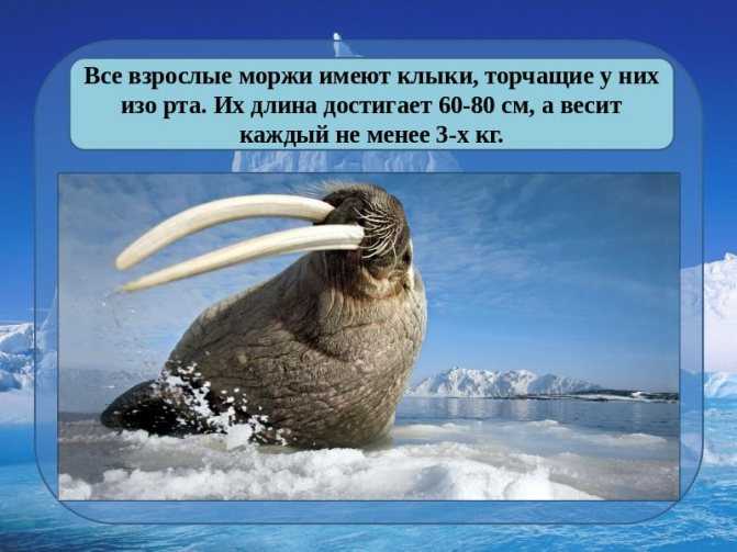 Все взрослые моржи имеют клыки, торчащие у них изо рта. Их длина достигает 60-80 см, а весит каждый не менее 3-х кг.