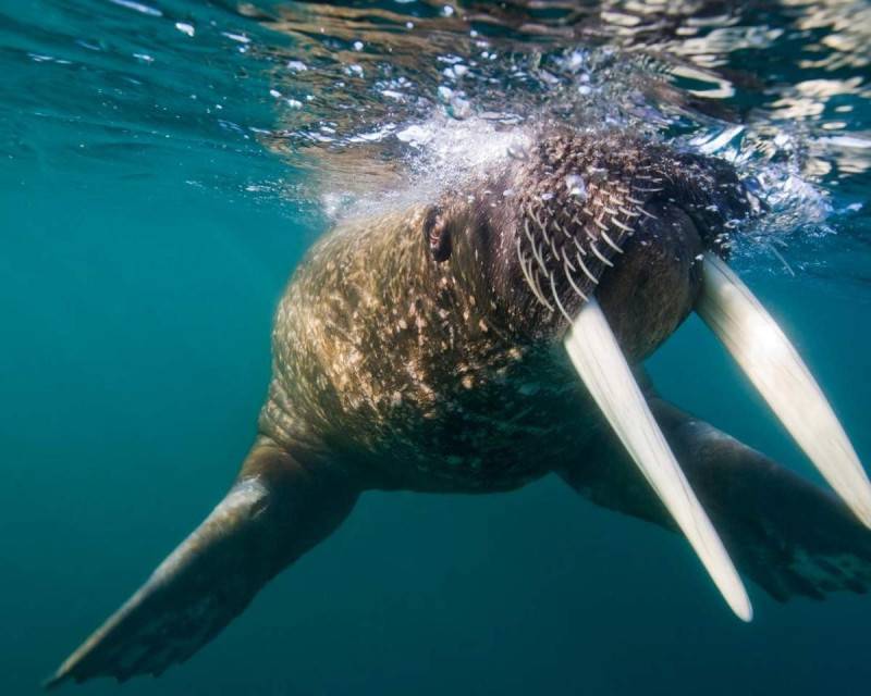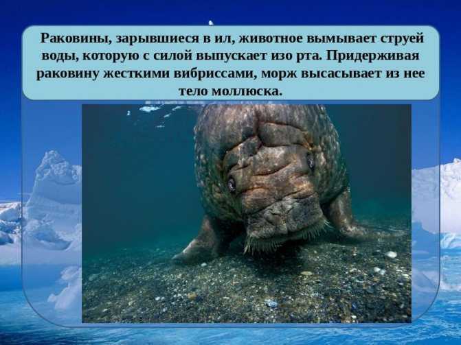 Основная пища моржей находится на морском дне – это пластинчатожаберные моллюски. Чувствительные вибриссы на морде животного помогают уловить их нахождение. Клыками, ластами, мордой зверь вспарывает илистое дно, разрыхляет грунт, поднимая тучи ракушек.