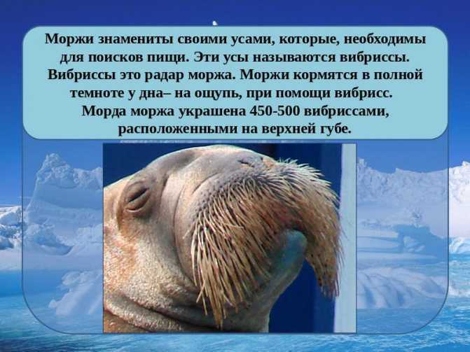 Моржи знамениты своими усами, которые, необходимы для поисков пищи. Эти усы называются вибриссы. Вибриссы это радар моржа. Моржи кормятся в полной темноте у дна– на ощупь, при помощи вибрисс. Морда моржа украшена 450-500 вибриссами, расположенными на верхней губе.