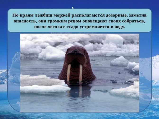 По краям лежбищ моржей располагаются дозорные, заметив опасность, они громким ревом оповещают своих собратьев, после чего все стадо устремляется в воду.
