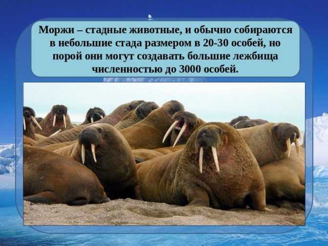 Моржи – стадные животные, и обычно собираются в небольшие стада размером в 20-30 особей, но порой они могут создавать большие лежбища численностью до 3000 особей.