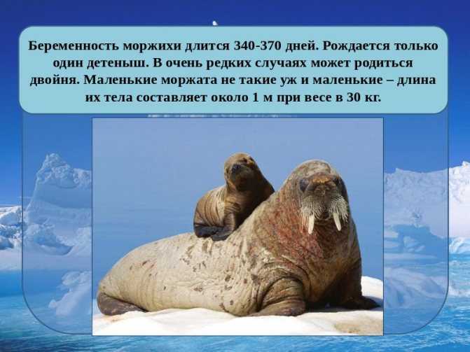 Беременность моржихи длится 340-370 дней. Рождается только один детеныш. В очень редких случаях может родиться двойня. Маленькие моржата не такие уж и маленькие – длина их тела составляет около 1 м при весе в 30 кг.