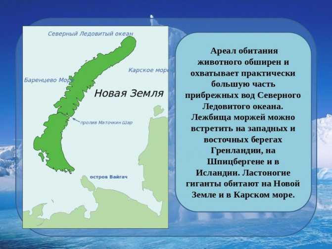 Ареал обитания животного обширен и охватывает практически большую часть прибрежных вод Северного Ледовитого океана. Лежбища моржей можно встретить на западных и восточных берегах Гренландии, на Шпицбергене и в Исландии. Ластоногие гиганты обитают на Новой Земле и в Карском море.