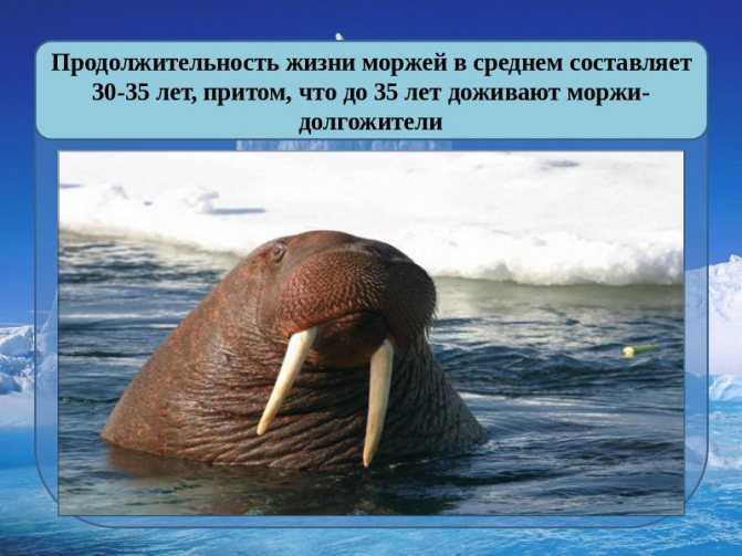 Продолжительность жизни моржей в среднем составляет 30-35 лет, притом, что до 35 лет доживают моржи-долгожители