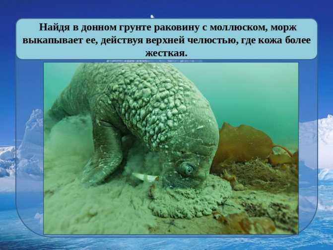 Найдя в донном грунте раковину с моллюском, морж выкапывает ее, действуя верхней челюстью, где кожа более жесткая.