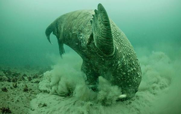 Мозолистыми ластами он ловко перетирает их, чтобы скорлупа раскололась и осела на дно. Тела моллюсков животное заглатывает вместе с водой. Насыщение приходит, когда объем пищи составит не менее 50 кг. Рыхление грунта оказывает положительное влияние на донную экосистему – создает благоприятные условия для развития организмов.
