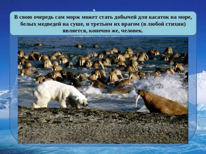 Противостоять же взрослой здоровой особи медведь не станет, для него есть более легкая добыча среди , нерп. В воде единственными противниками моржей являются , они крупнее моржей и обладают острыми зубами. Спасаясь от касаток моржам приходится выбираться на сушу.