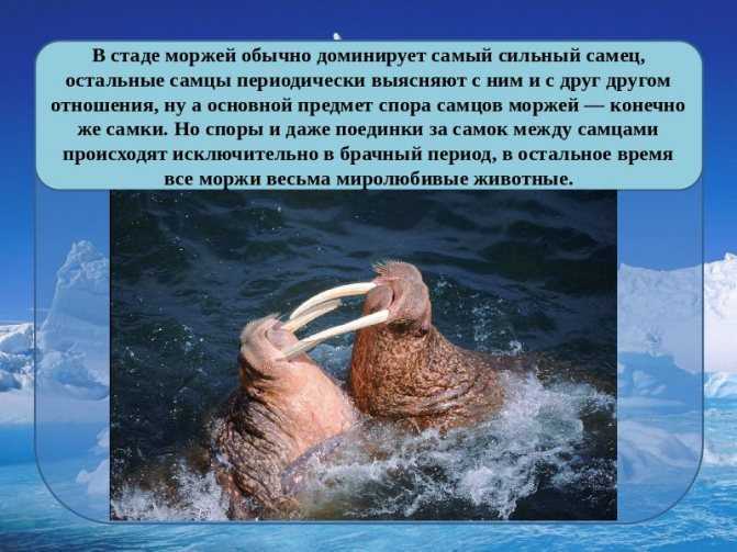 Животные могут нанести раны друг другу клыками. Толстая кожа до 3-4 см, слой жира защищают внутренние органы, поэтому драки самцов обходятся без тяжелых последствий. Моржи соревнуются не только в силе, но и в вокальных данных, призывая самок к спариванию с самыми голосистыми из них. Браки совершаются в водной стихии.