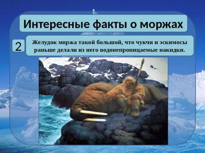 Интересные факты о моржах 2 Желудок моржа такой большой, что чукчи и эскимосы раньше делали из него водонепроницаемые накидки.