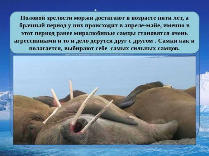 Половая зрелость приходит раньше к самкам – они готовы к спариванию в 4-6 лет. Самцы зреют дольше, начинают проявлять интерес к моржихам в семилетнем возрасте, но приступают к размножению позже – к 15 годам. Появление потомства в жизни самки происходит с периодичностью в 3-4 года. Брачный сезон открывается в апреле – начале мая. Половозрелые животные меняют поведение, демонстрируя интерес к особям противоположного пола.