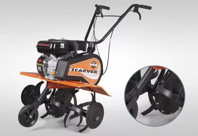 В своей стандартной комплектации они тоже имеют культивирующие фрезы и сошник. Кроме этого, всегда в комплекте присутствуют пневматические колеса. На витринах обычно их и выставляют на этих самых колесах. Иногда в комплект культивирующие фрезы могут не входить — это делается для тех, кто не собирается использовать данную технику для обработки земли, и если бы этот человек приобрел данный агрегат с фрезами, то они бы просто валялись без дела. А так можно сэкономить.