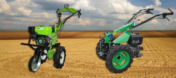 Мотоблоки имеют два пневмоколеса, за счет чего более стабильны. Усилия при работе минимальны, приходится лишь контролировать направление.