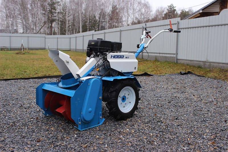 В зимний период к мотоблоку можно прицепить роторный снегоуборщик и использовать для быстрой уборки снега с дорожек вокруг дома.