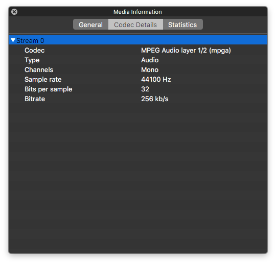 Используемый кодек — MPEG Audio Layer 1/2 (mpga). Частота дискретизации та же, что составляет 44 100 Гц. Это стандарт качества компакт-дисков, который работает для большинства устройств, программ и онлайн-сервисов.