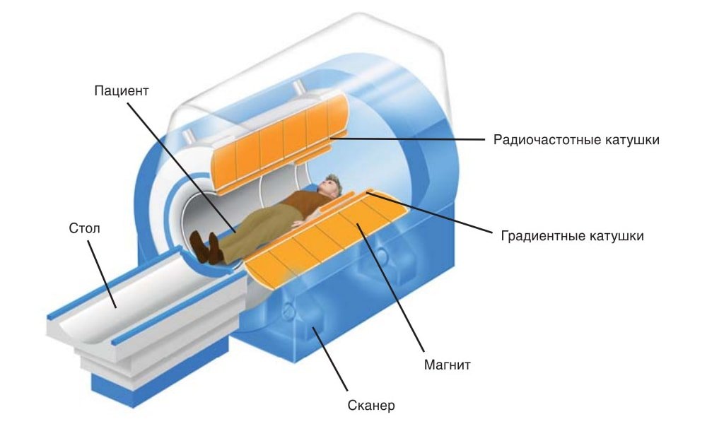 Аппарат выглядит как большой ящик с тоннелем в центре, в который помещен выдвижной стол. Исследование обычно длится дольше, чем КТ или рентгенография, и может занять от 20 минут до полутора часов в зависимости от исследуемой области. Поэтому скрининг для пациентов, страдающих клаустрофобией, становится проблематичным.