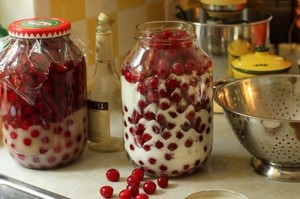 Чистые ягоды с косточкой необходимо послойно засыпать в банку, причём каждый слой должен быть пересыпан сахаром. После чего добавляется 200 мл чистой воды. Нужно проследить, чтобы в банке оставалось несколько сантиметров свободного пространства, поскольку в результате процессов брожения вишня будет подниматься. Далее, будет необходимо слегка помять содержимое с помощью любого подходящего для этих целей кухонного предмета.