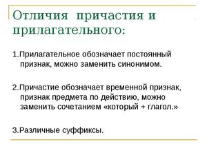 - Чтобы не потеряться в значениях слов, нужно не забывать, что причастные слова, в отличии прилагательных, имеют вид, время, а также к ним можно применить модальные и переходные свойства. Также запомните, что причастные слова всегда образовываются от глагольных слов, а прилагательные от существительных.