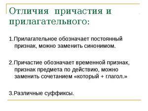 - Чтобы не потеряться в значениях слов, нужно не забывать, что причастные слова, в отличии прилагательных, имеют вид, время, а также к ним можно применить модальные и переходные свойства. Также запомните, что причастные слова всегда образовываются от глагольных слов, а прилагательные от существительных.