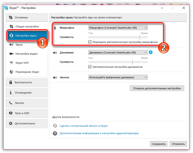 Затем зайдите в настройки звука в левом меню нового окна и проверьте работу микрофона. Здесь можно назначить ваш микрофон для работы в скайпе, а также настраивать его громкость.